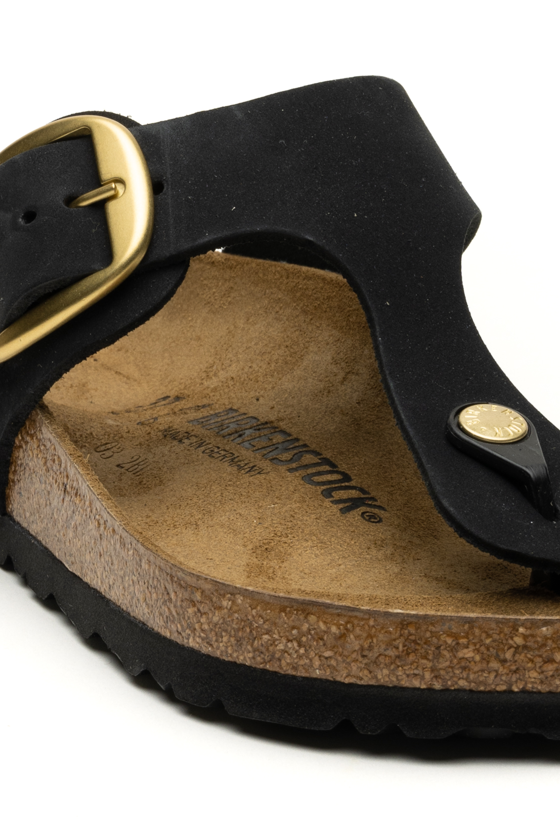 Sandalo infradito comodo e alla moda, caratterizzato da un'elegante fibbia a spillo. È dotato di un plantare sagomato in sughero rivestito in pelle per garantire comfort e sostegno.