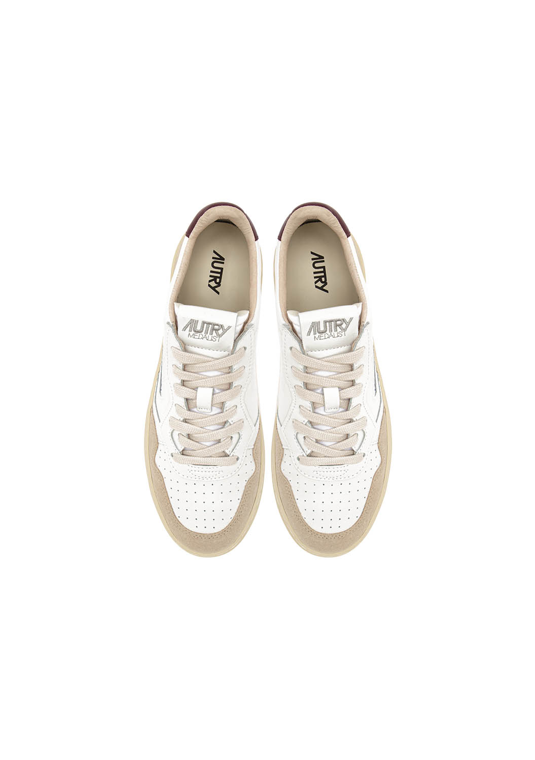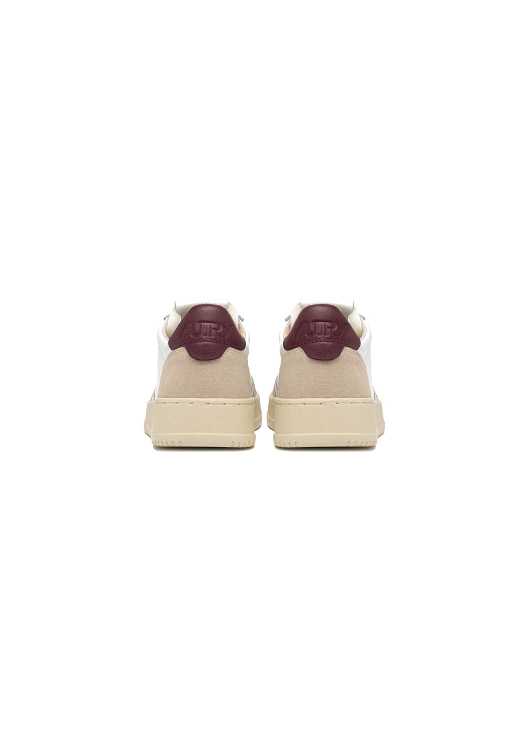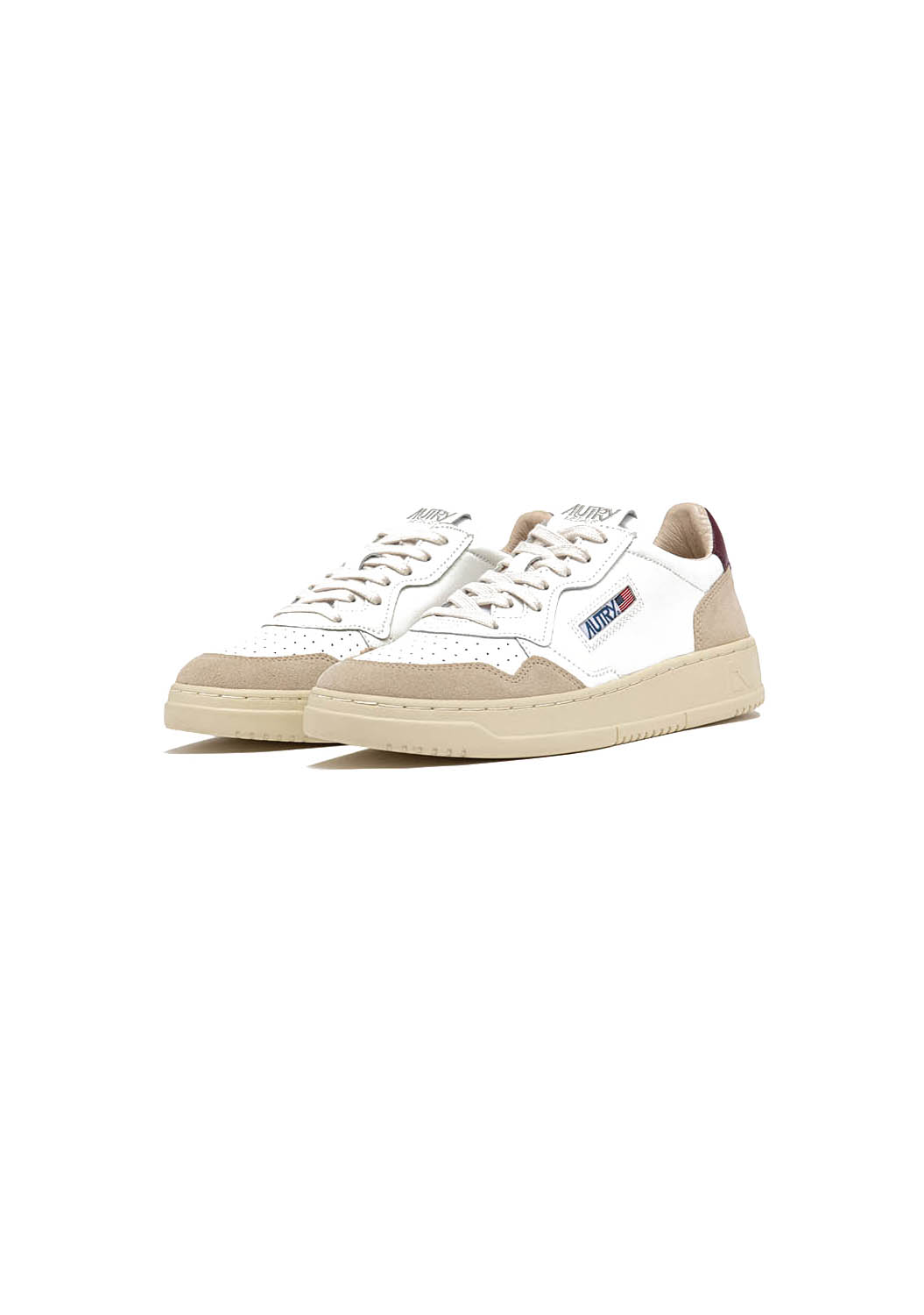 Rielaborata con proporzioni moderne e materiali di qualità, al passo con la contemporaneità.Questa scarpa da ginnastica è realizzata in pelle bianca dall'aspetto autentico ed è rifinita con rinforzi in suede beige per un mix tattile e grafico deciso.Il dettaglio in pelle bordeaux che decora il tallone è personalizzato con il logo Autry.