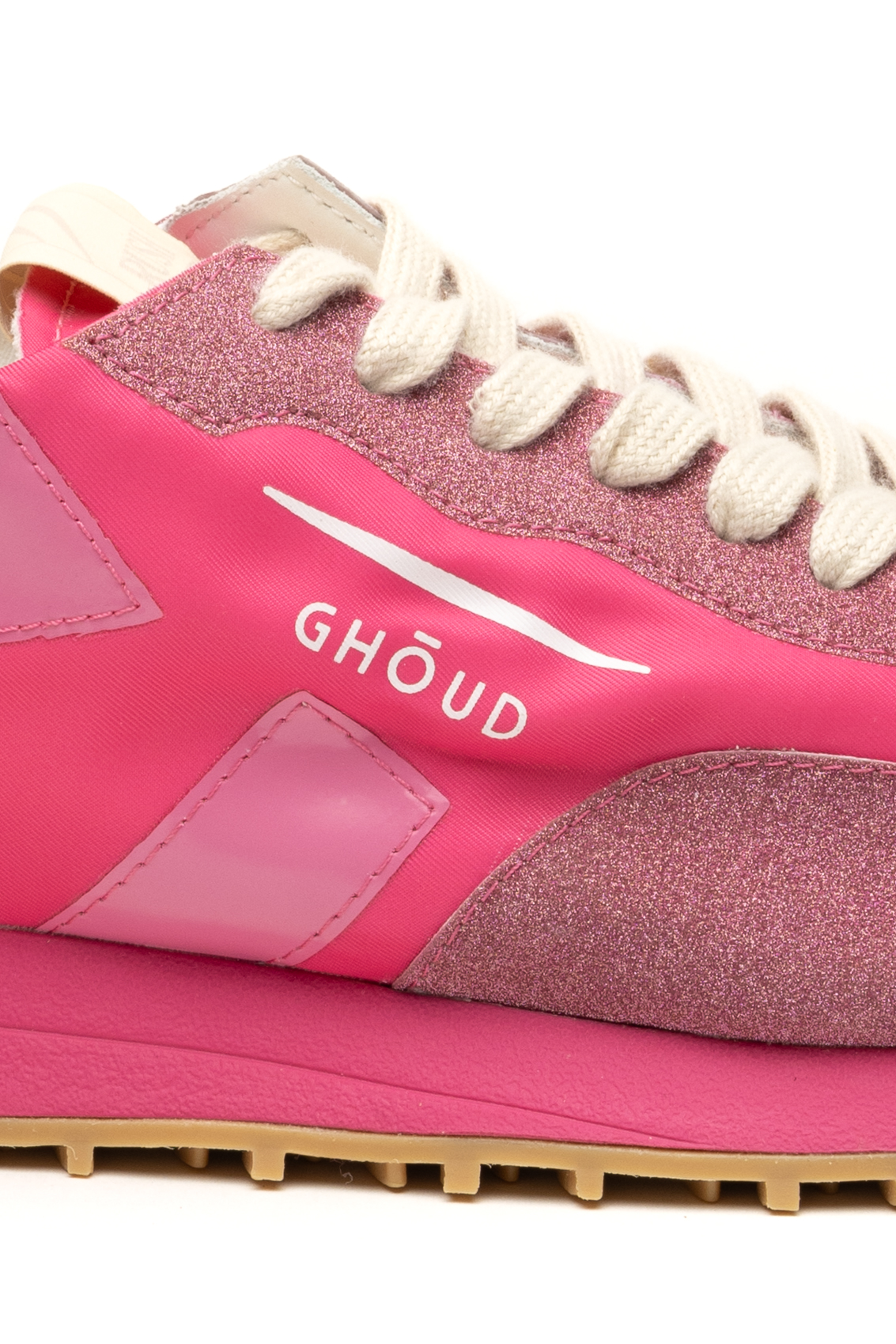 Contemporanea fashion running, il modello Rush Starlight Monoblock di Ghoud presenta un design minimale caratterizzato da linee geometriche e decise. Tomaia in nylon con dettagli glitter. Iconico logo ricamato lateralmente. Doppio laccio.