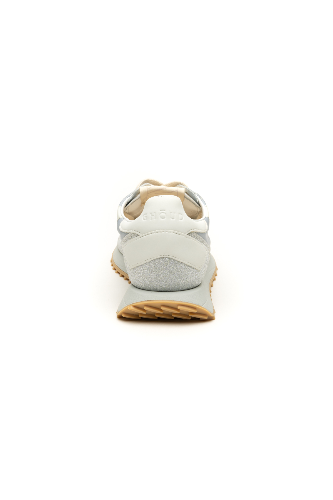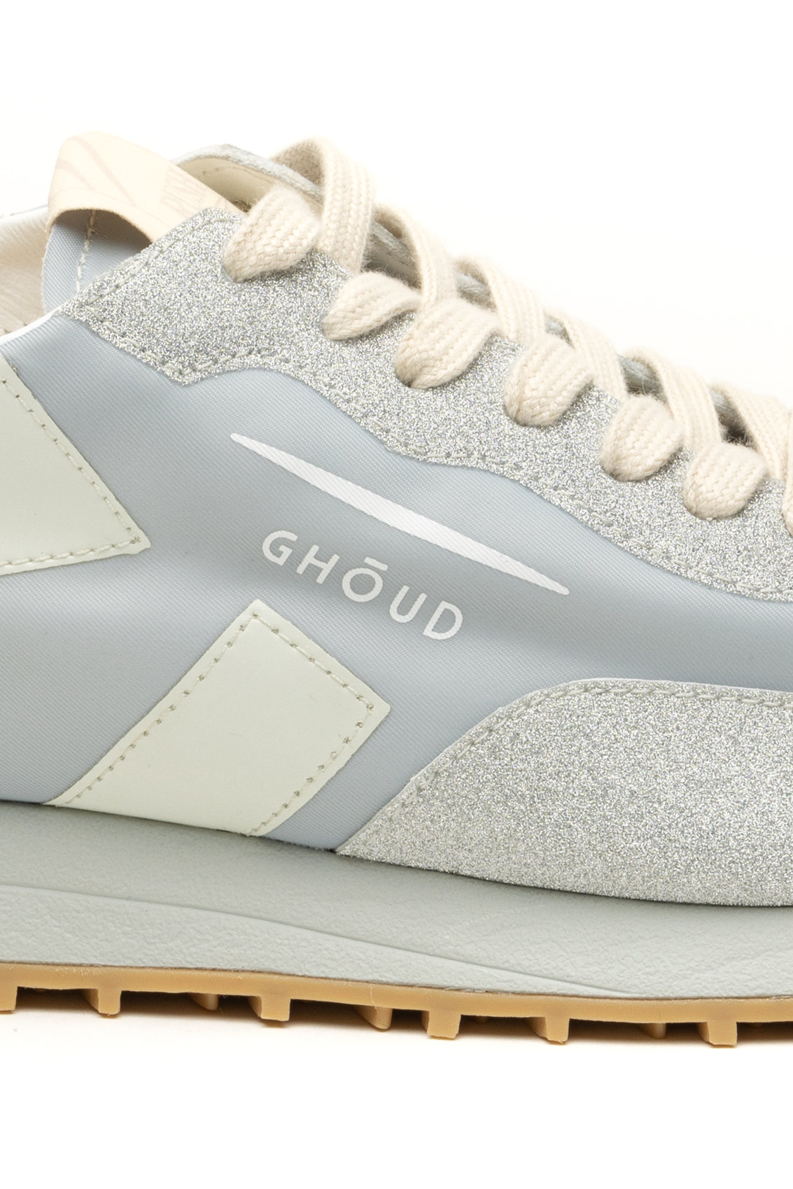 Contemporanea fashion running, il modello Rush Starlight Monoblock di Ghoud presenta un design minimale caratterizzato da linee geometriche e decise. Tomaia in nylon con dettagli glitter. Iconico logo ricamato lateralmente. Doppio laccio.