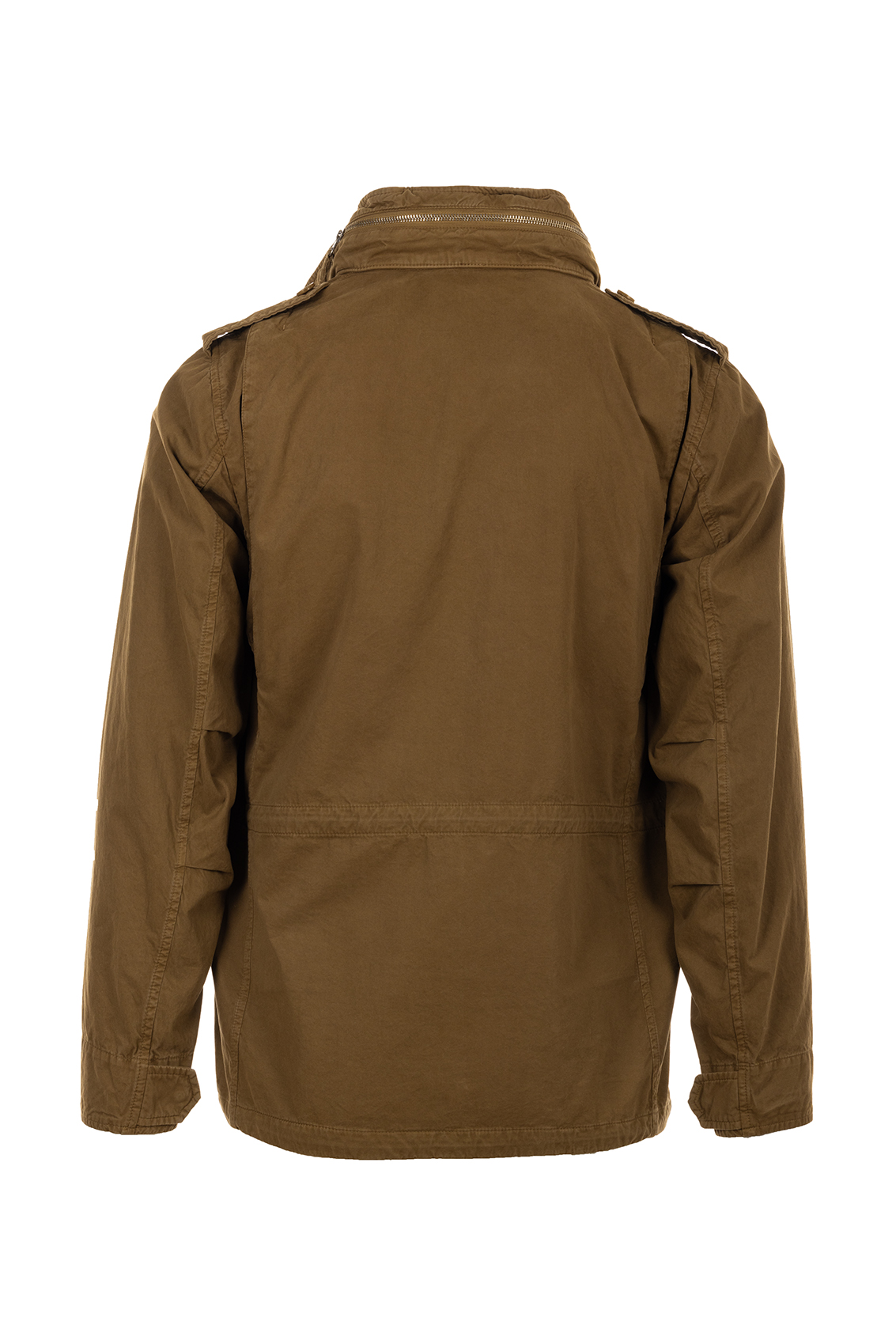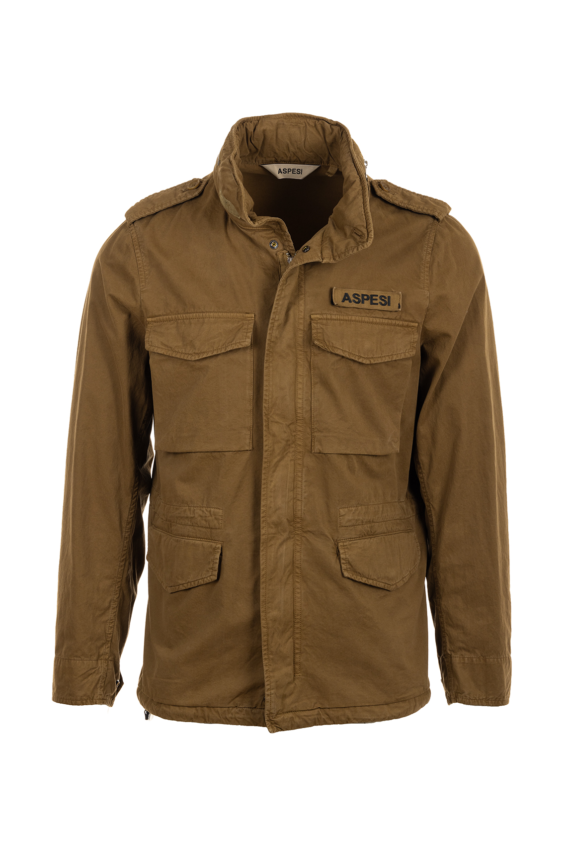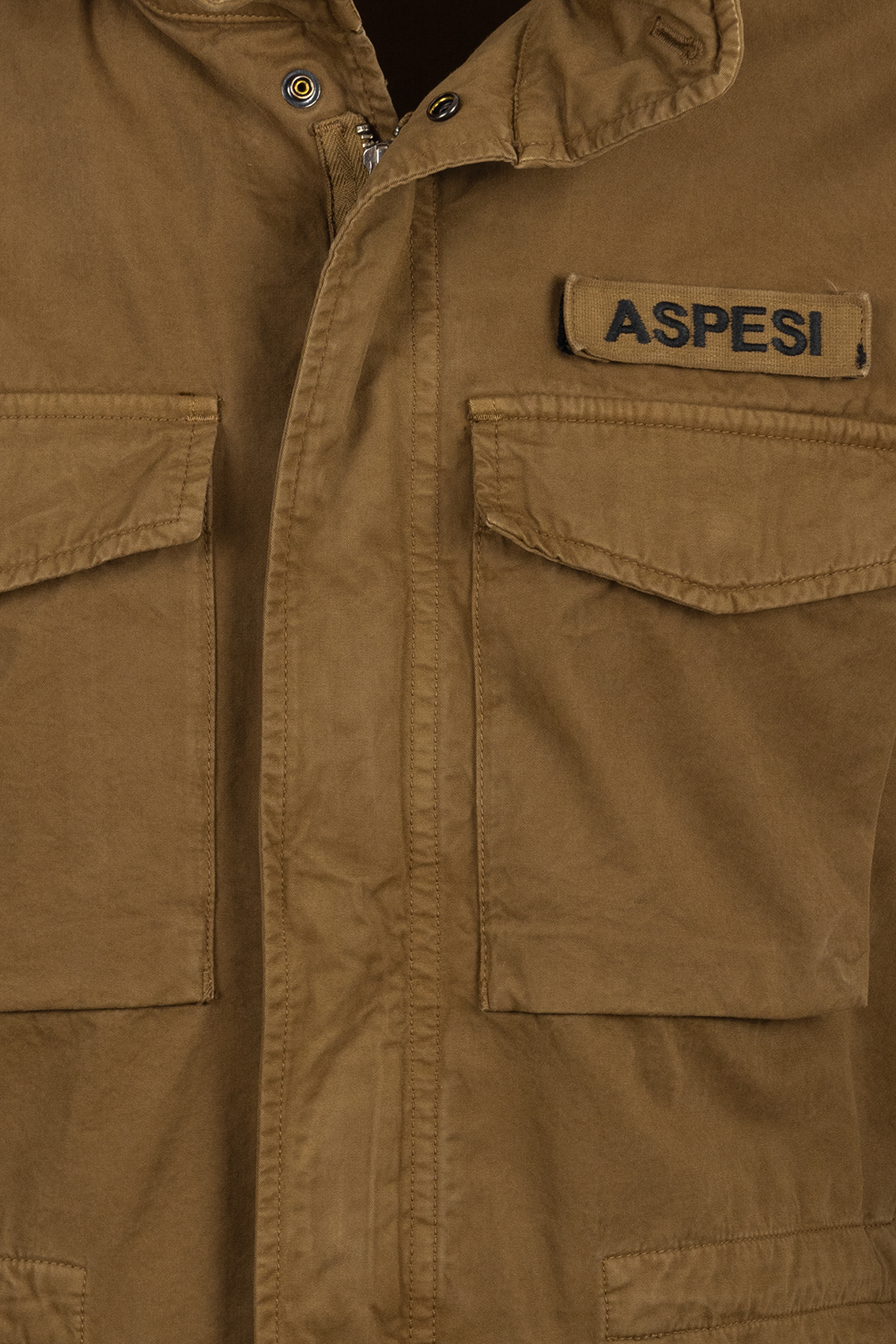 Chiusura con zip e bottoni a pressione nascosti e patta antivento, quattro tasche applicate, cappuccio in nylon staccabile nascosto nel colletto, alamari sulle spalle, coulisse in vita, nastro militare con ricamo Aspesi sul petto a sinistra, rimovibile con velcro.