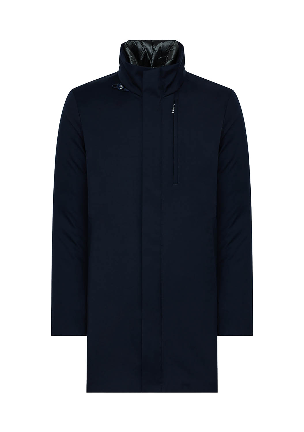 Cappotto 3in1 realizzato in lana tecnica 3-Layer con cuciture interne coperte da nastro termosaldato, caratterizzato all'interno da piumino staccabile in tessuto tecnico superlight cangiante portabile anche separatamente. Collo in piedi nel quale è ripiegato un cappuccio chiuso da Velcro, doppia chiusura frontale con zip e automatici nascosti e chiusura con zip per le tasche laterali a filetto e l'ampia tasca al petto.
